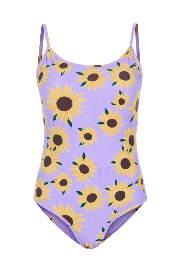 Hunkøn Sunny swimsuit is a lined swimsuit with a round neck in the tropical "Sunflower Art print".